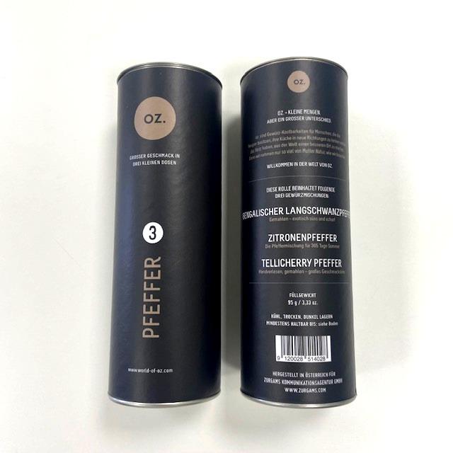 Gewürzmischungen aus dem Hause OZ, abgeleitet von der Maßeinheit Unze.